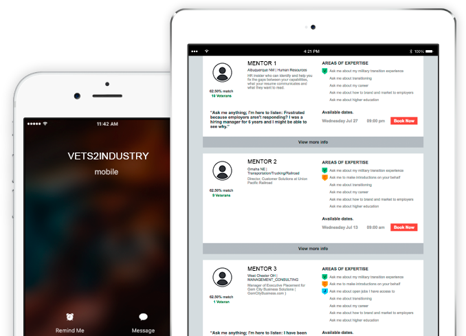 After launching a successful pilot program in November 2015, VETS2INDUSTRY opens the platform to Service Members, Veterans, Military Spouses, and Mentors across the country. Since opening, mentees have been averaging 3.7 mentor calls per active user. 98% of mentors report they want to mentor again. Compared with competitors charging job applicants for career coaching and guidance, VETS2INDUSTRY has provided millions of dollars worth of free mentorship for 10k+ members and is partnered with the nation’s leading Veteran Service Organizations and Military Employers to deliver free, on-demand mentoring to our entire military community.